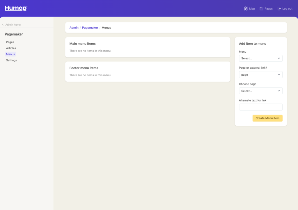 On the left, you can use dropdown menus to create a footer or main menu item, decide whether it links to a page or an external link, choose a page, and add alternative text for the link if needed.