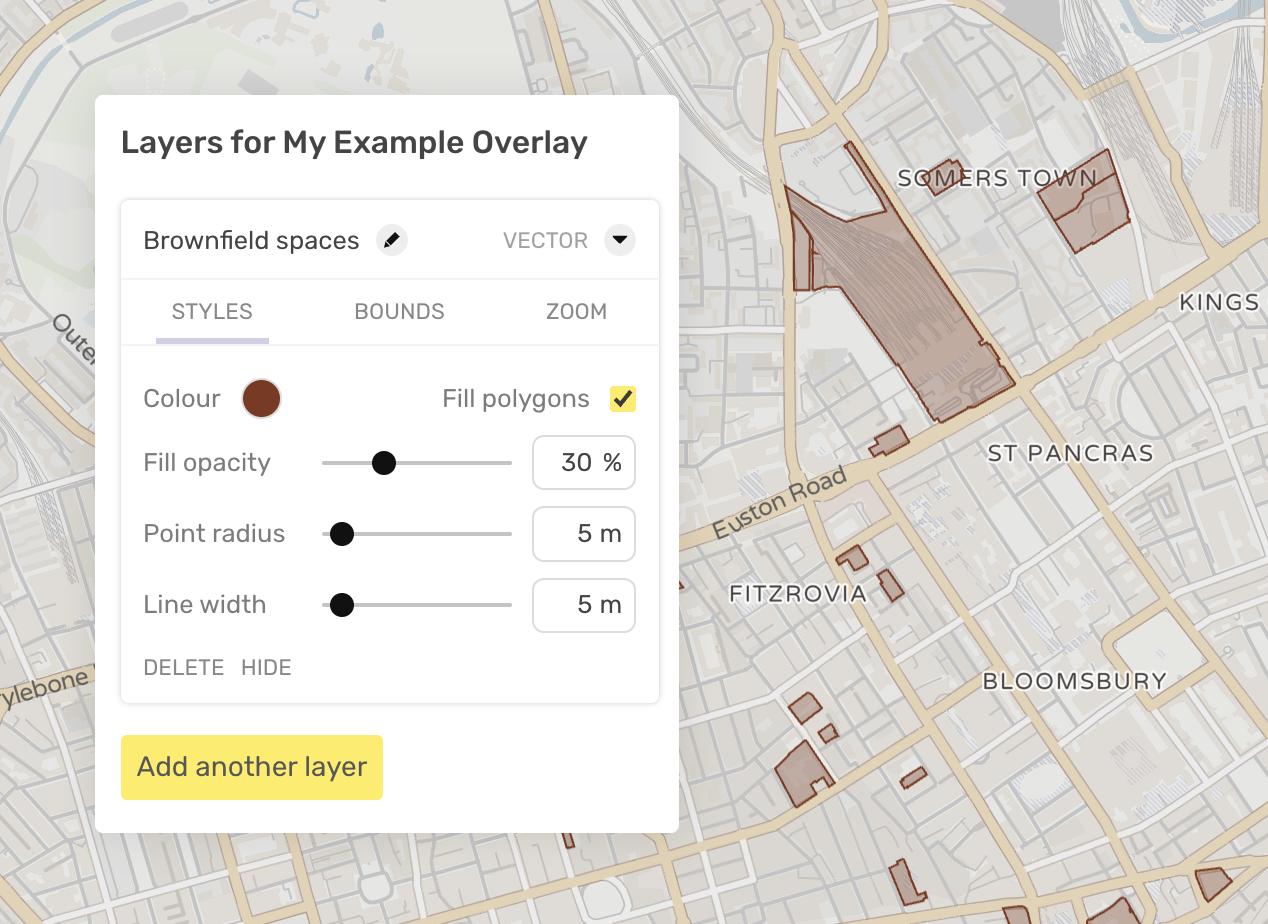 Vector or raster data is known as an ‘overlay’ within the Humap platform. You can upload a geojson file or paste the URL of an overlay that is hosted elsewhere. If your raster image (typically a historical map) is georectified, we can upload the image to our servers and add it to your project for you. We hope to develop this feature as a self-service option in the near future. Vector data can be uploaded by yourself to add as an overlay using our overlay tools.